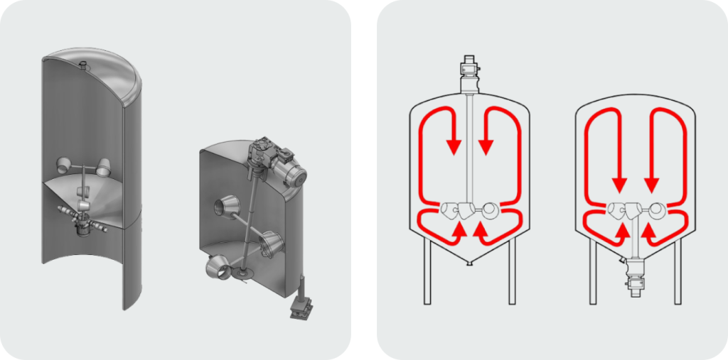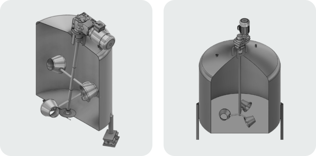 The VM2 Bottom-Mount agitator is engineered for tall tanks, silos, and high-volume processing vessels. Installed at the base, it provides stable and efficient mixing without long shafts or top-heavy assemblies, reducing material requirements and improving mechanical reliability.