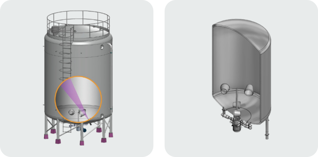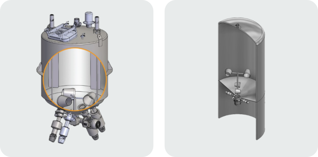 Bottom installation eliminates spray shadows and ensures full product circulation. The VM2 design allows convenient access to motor and gearbox for fast maintenance. It is also available in custom Flow-Balance Tank configurations, which can be certified as pressure vessels. With Smart-Connect capability, multiple tanks can operate in series for continuous processing.