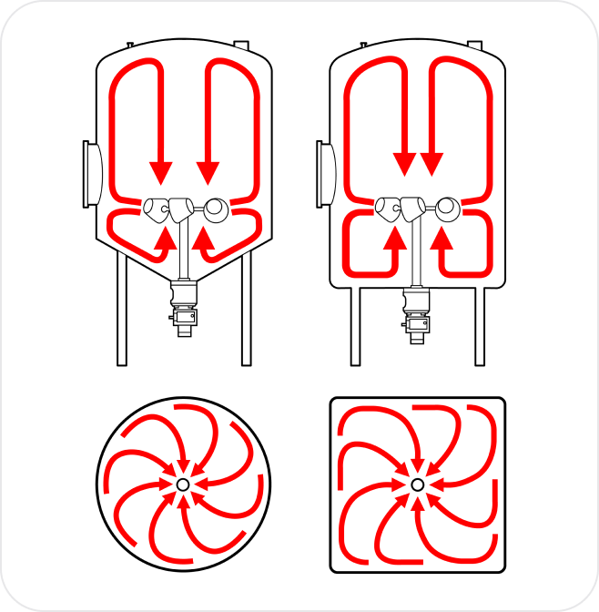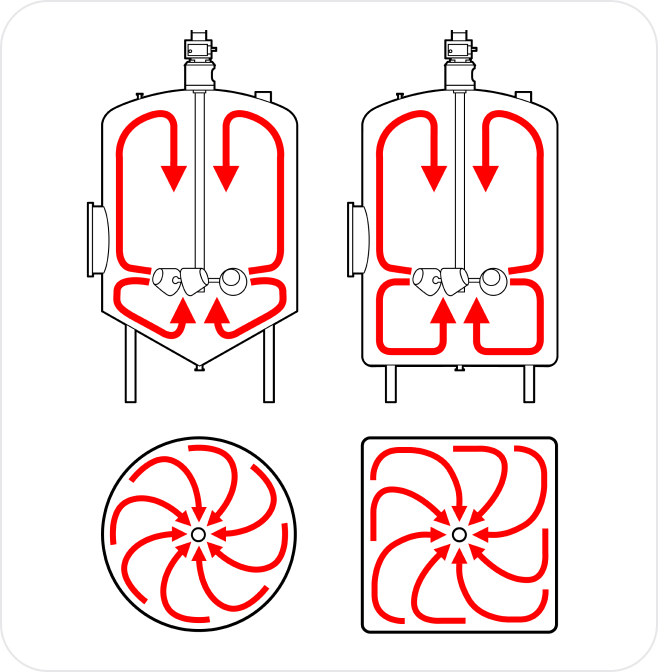 The ViscoMix uses converging hollow-body impellers that accelerate product toward the tank wall and create combined vertical and horizontal circulation throughout the vessel. This circulation pattern ensures complete product movement and efficient mixing across the entire tank volume.