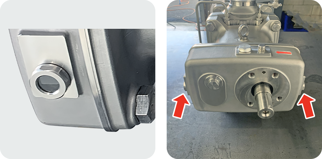Each ViscoTwin Pump includes TWO (2) Oil Sight Glasses, one on each side of the Gear Housing, so that a visual confirmation of oil levels can be easily achieved when space is constrained or limited.