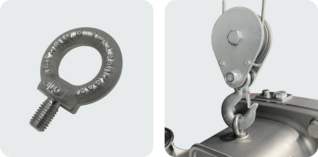Every ViscoTwin Pump includes a Lifting Hook for safe pump handling. This Lifting Hook fully supports the weight of the pump.