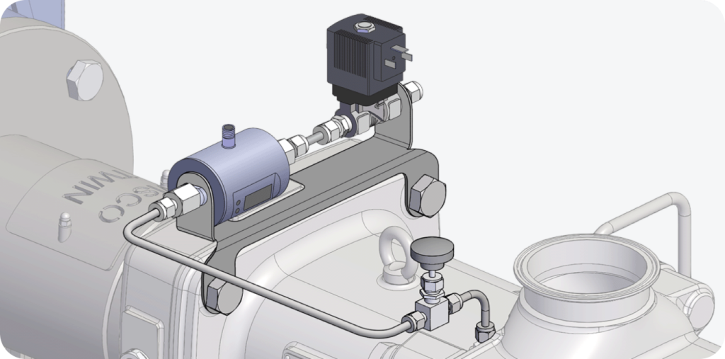 Allows you to insure the supply of seal water to both Mechanical Seals in series. Includes a Flow Meter with Set Point, a Solenoid or Pneumatic Shut-Off Valve. Piping as well as compression fittings are in stainless steel.